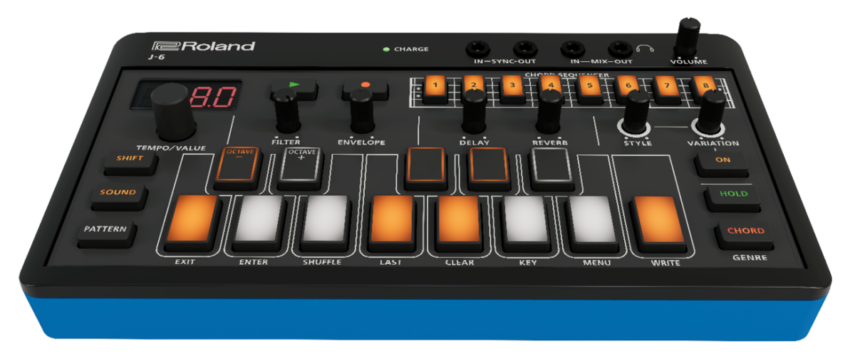 Синтезатор Roland J-6 — компактный аккордовый синтезатор с тонами Juno-60. Аккордовый секвенсор, арпеджиатор, эффекты. Работа от аккумулятора, USB-C, MIDI, вход/выход синхронизации. Для быстрого создания идей.