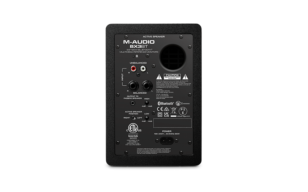 M-Audio BX3 BT оснащен элементами управления на задней панели, которые позволяют настраивать эквалайзер и размещение активных динамиков. Элементы управления High-EQ и Low-EQ позволяют любому добавить немного дополнительного гула или ясности в свою музыку. Переключатель Left/Right Active Speaker Position позволяет вам выбрать, какой динамик будет левым или правым. Это очень полезно, если вы левша и хотите, чтобы динамик с регулятором громкости на передней панели был слева.