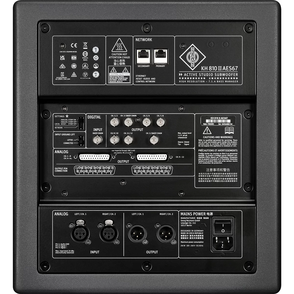 Профессиональные студии все чаще переходят на форматы иммерсивного аудио (Dolby Atmos, Auro-3D) и используют современные сетевые технологии Audio-over-IP (AoIP). Neumann KH 810 II AES67 — это не просто сабвуфер, а мощный активный DSP-контроллер, созданный специально для решения этих новых задач. Он представляет собой бескомпромиссное сочетание глубоких, чистых низких частот и передовых возможностей многоканального управления, необходимых в самых требовательных конфигурациях — от высококлассных систем стерео до полноценных иммерсивных установок формата 7.1.4.