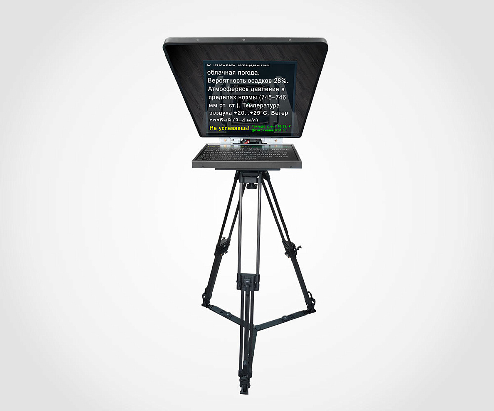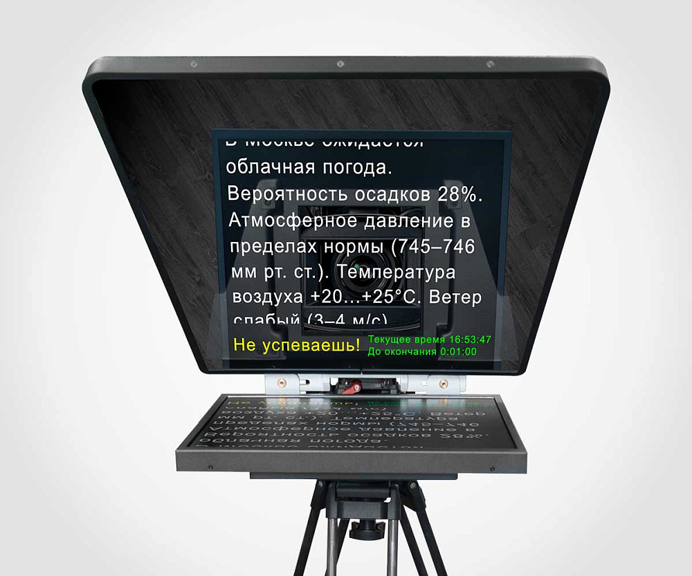 Для качественного отображения текста перед объективом камеры необходима надежная оптика. В комплект входит 25-дюймовое зеркало, установленное в непрозрачный тубус. Зеркало имеет специальное покрытие (например, "Титан"), обеспечивающее прозрачность около 85%. Это позволяет диктору видеть текст, четко отражающийся от зеркала, в то время как камера "смотрит" сквозь него прямо на ведущего, оставаясь незаметной для зрителя.