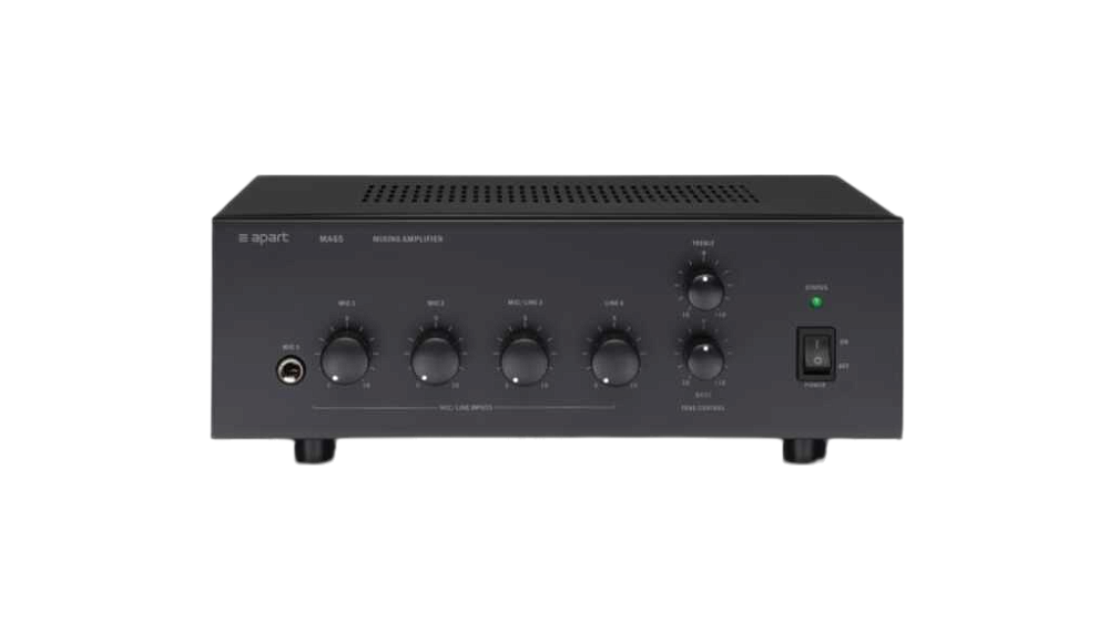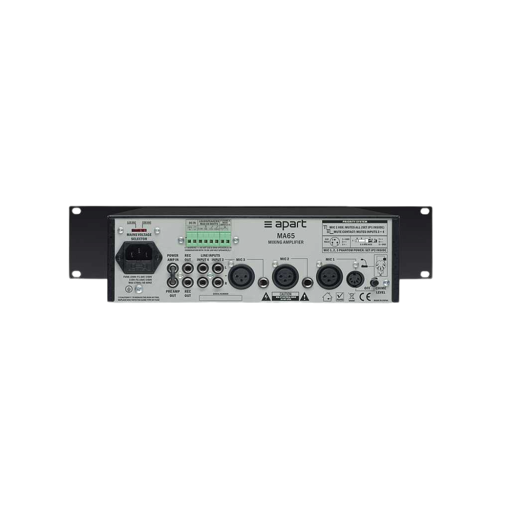 MA65, вероятно, является самым компактным и многофункциональным микшерным усилителем мощностью 65 Вт и напряжением 100 В. Несомненно, это устройство может стать основой многих небольших инсталляций, где требуется приоритетный или смешанный микрофонный вызов и рассеивание фоновой музыки. Кроме того, этот усилитель можно использовать в мобильных приложениях, поскольку MA65 работает от 24 В (грузовики, автобусы, аварийное питание).