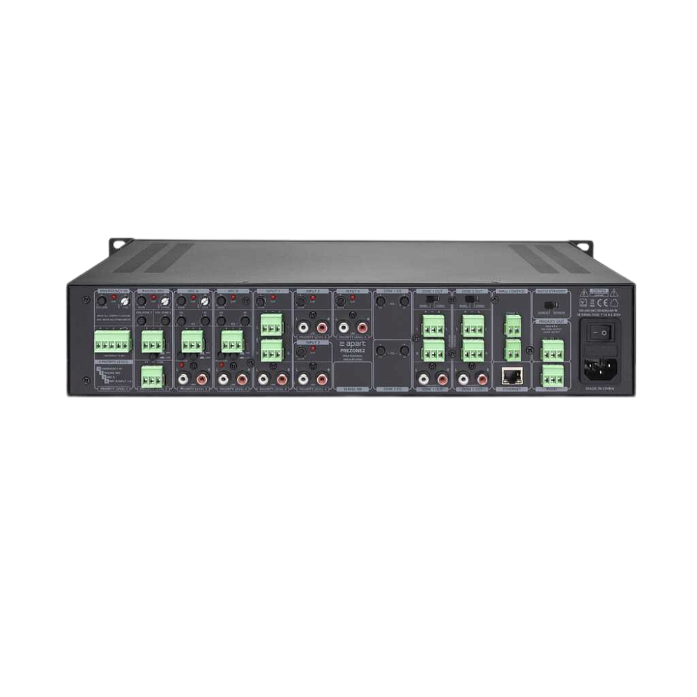 PREZONE2 оснащен четырьмя уровнями приоритета для маршрутизации звука: один вход для экстренных вызовов, один вход для пейджинговой связи, два микрофонных входа и четыре стереовхода. Каждый выходной канал оснащен независимым переключателем моно/стерео на задней панели, а PREZONE2 также поддерживает управление через веб-страницу, удобную для мобильных устройств, RS-232 или настенные панели.