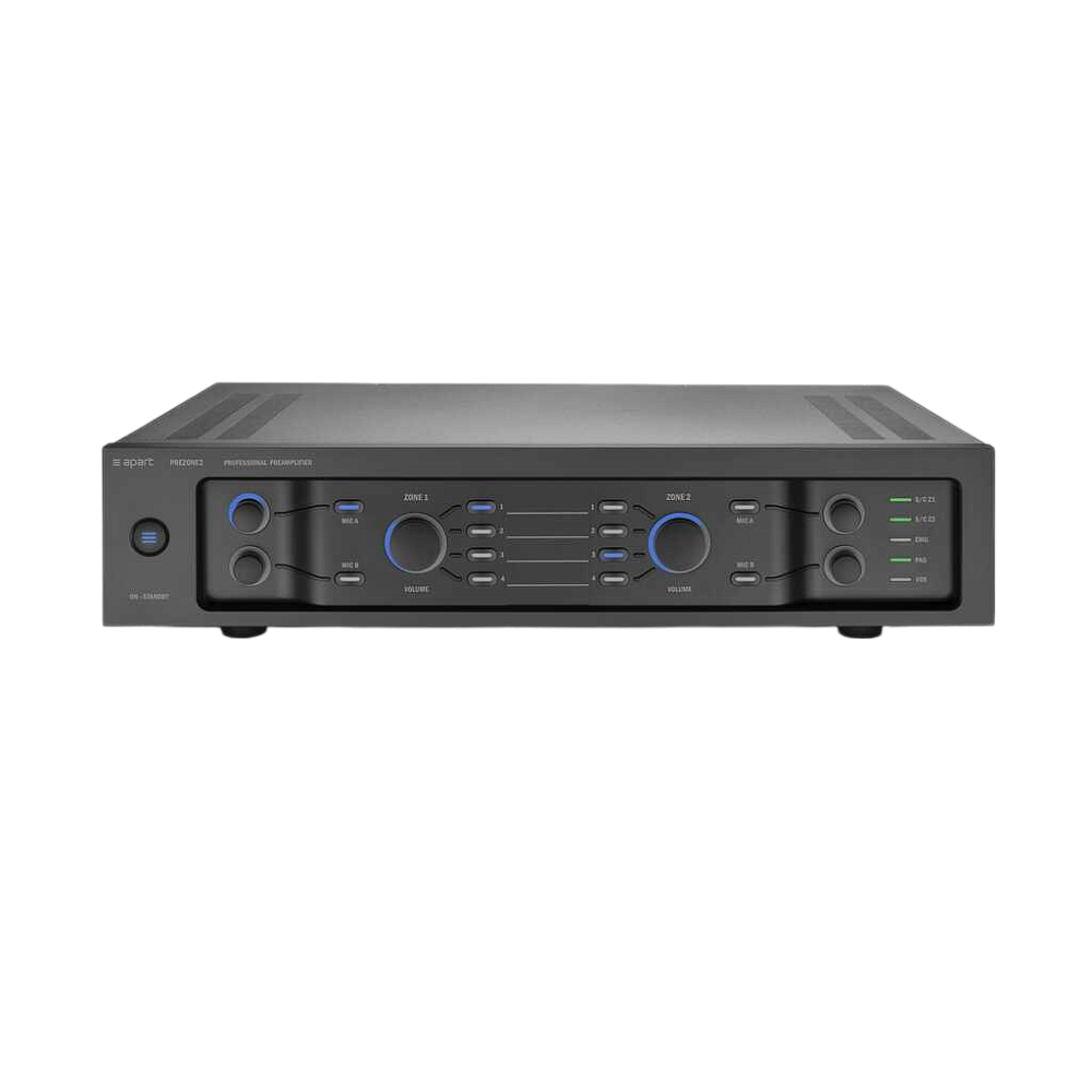 PREZONE2 — это многофункциональный стереофонический предусилитель, который позволяет пользователям независимо управлять источником звука и громкостью в двух зонах, а также использовать выборочную зону оповещения. Передняя панель PREZONE2, разработанная для удобства использования, включает в себя регуляторы громкости, выбора источника звука и микрофона для каждой зоны, обеспечивая мгновенную визуальную обратную связь о работе системы.
