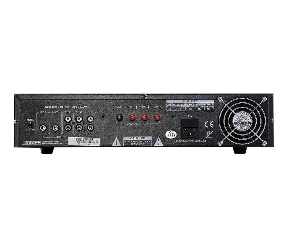 Трансляционный усилитель DSPPA MP-1000P — настольный микшер-усилитель мощностью 350 Вт для профессиональной трансляции. 3 микрофонных входа, 2 AUX входа, 1 AUX выход. Выход 100 В/70 В или на колонки 4–16 Ом. Приоритет микрофона на передней панели. Регулировка громкости каналов, эквализация НЧ/ВЧ, индикатор уровня, защита от КЗ.