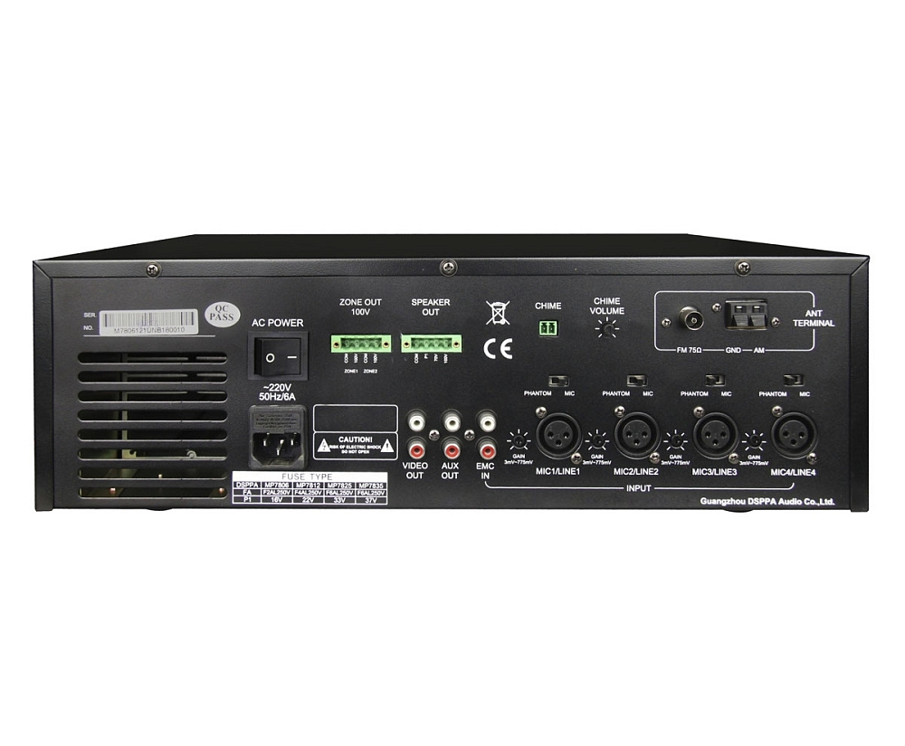 Трансляционный усилитель DSPPA MP-7806 — настольный микшер-усилитель со встроенными источниками аудиосигнала (DVD/CD/MP3-плеер, цифровой AM/FM-тюнер, USB). Видеовыход. 2 зоны трансляции. 4 мик/лин. входа, AUX вход/выход. Фантомное питание, приоритет микрофона и сигнала CHIME. Эквализация, индикатор уровня, защита от КЗ и перегрузки. Управление с ИК-пульта.