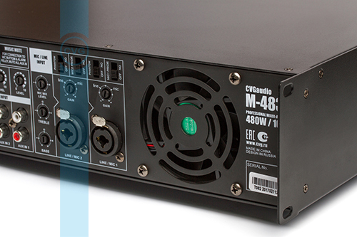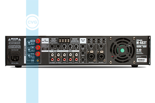 CVGaudio M-483T – профессиональный микшер–усилитель предназначенный для организации качественных систем трансляции фоновой музыки и речевого оповещения в торговых и общественных помещениях. Данная модель обеспечит отличное качество звучания и по настоящему богатый функционал. Усилитель имеет мощность 480W и может работать как в трансформаторном 100V (основной режим работы), так и низкоомном 4-16ohm. Усилитель одноканальный, подключаемые к нему стереофонические линейные сигналы от источников звука корректно суммируются и на акустические системы подается уже усиленный, монофонический сигнал, более корректный для систем фонового звука и Public Address (имеющий более равномерное звуковое поле). CVGaudio M-483T имеет три линейных входа выполненные на разъемах 2RCA с возможностью выбора активного с помощью селектора на лицевой панели. Каждый вход имеет индивидуальную настройку чувствительности. Также усилитель имеет два универсальных балансных входа выполненных на комбо-разъемах TRS Jack 6.3mm / XLR. Настраиваемый уровень чувствительности данных входов позволяет использовать их как для подключения микрофонов, так и источников сигнала линейного уровня. Линейные и микрофонные входа имеют раздельные двухполосные эквалайзеры, что позволяет осуществлять индивидуальную, тонкую настройку звучания как для микрофонов, так и для устройств воспроизведения музыкального контента. Каждый балансный вход имеет индивидуальную активацию приоритета над линейными входами и фантомное питание 24V для работы с конденсаторными / электретными балансными микрофонами. Если включен селектор активации приоритета, то при появлении входящего звукового сигнала на контактах данного входа все остальные линейные входа мьютируются. Также мьютирование можно осуществлять с помощью управляющих контактов – MUSIC MUTE и FULL MUTE. При замыкании пары контактов MUSIC MUTE все линейные входа мьютируются, а при замыкании контактов FULL MUTE мьютируюся все, и линейные и микрофонные входа (контакты “нормально разомкнутые”). Данная возможность позволяет интегрировать усилитель CVGaudio M-483T в систему пожарного оповещения и другие системы автоматики, где возможно управление через “сухие контакты”. Данная модель имеет актуальный пожарный сертификат и может использоваться в системах аварийно-пожарного оповещения. Усилитель выполнен в металлическом корпусе, лицевая панель из алюминия. В комплект поставки входят кронштейны для установки в монтажный шкаф, прибор при установке в стойку будет занимать высоту 2U. Основная масса элементов управления усилителем вынесена на заднюю панель, что ограничивает доступ к ним со стороны не квалифицированного обслуживающего персонала. CVGaudio M-483T имеет все необходимые для подобных устройств системы защиты – защиту от перегрузки, перегрева, предохранитель по питанию, защиту от короткого замыкания. Усилитель имеет постоянное активное охлаждение. Благодаря использованию качественного вентилятора шум при работе усилителя минимален. Скорость вращения вентилятора зависит от температуры нагрева радиатора. Отличное качество звучания и продуманная до мелочей эргономика делают данную модель (как в прочем и все остальные усилители серии М) идеальным устройством для использования в составе качественных систем фонового звука, а высокое качество сборки и используемых элек