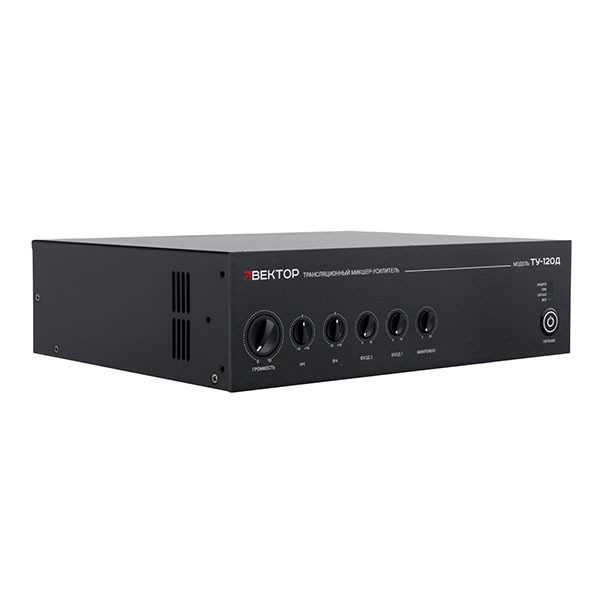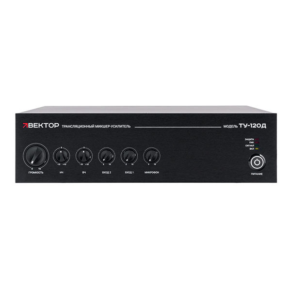Трансляционный усилитель Вектор ТУ-120Д — комбинированный микшер-усилитель класса D на 120 Вт для музыкально-речевого оповещения. Универсальный вход (мик/лин) с приоритетом и фантомным питанием, 2 линейных входа. Выход 100 В или на акустику 4–16 Ом. Двухполосный эквалайзер, защита от КЗ. Рэковое крепление в комплекте.