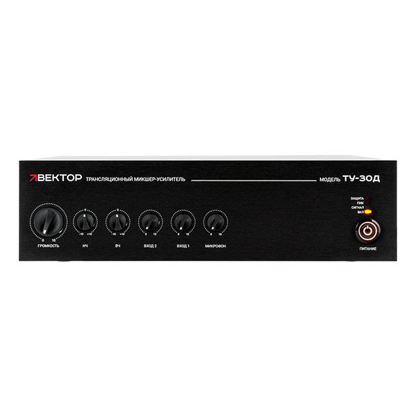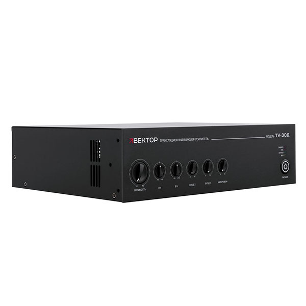 Трансляционный усилитель Вектор ТУ-30Д — компактный микшер-усилитель класса D на 30 Вт для фоновой трансляции и объявлений в небольших зонах. Универсальный вход (микрофон/линия) с приоритетом и фантомным питанием, 2 линейных входа. Подключение колонок на 100 В или 4–16 Ом. Эквалайзер НЧ/ВЧ, защита от КЗ. Рэковое крепление.