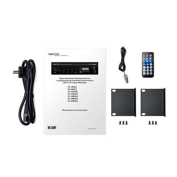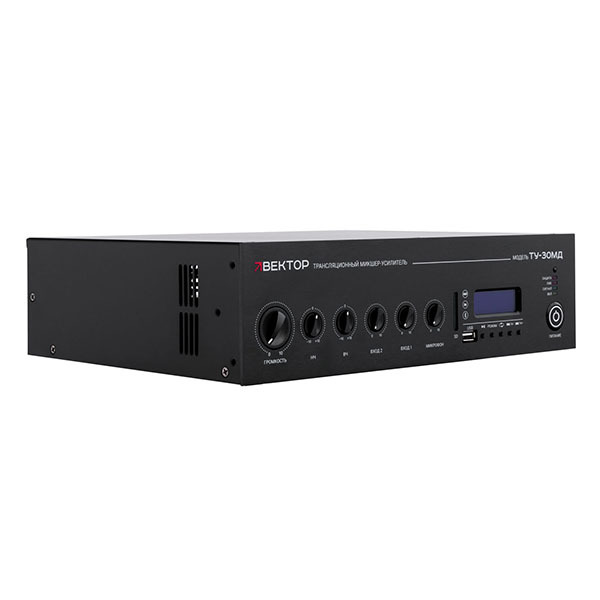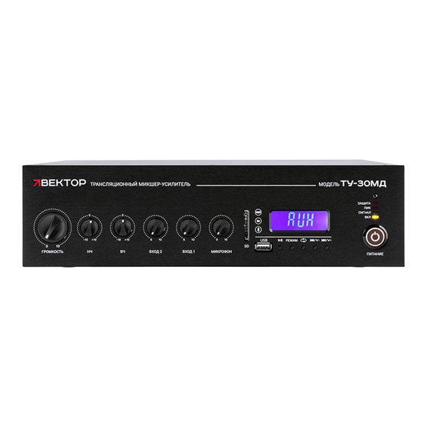 Трансляционный усилитель Вектор ТУ-30МД — компактный комбинированный микшер-усилитель класса D на 30 Вт со встроенными аудиоисточниками (MP3, FM, USB/SD, Bluetooth). Для фонового озвучивания и объявлений. Универсальный вход с фантомным питанием, 2 линейных входа. Выход 100 В или 4–16 Ом. Эквалайзер, защита, зарядка USB. Рэковое крепление.