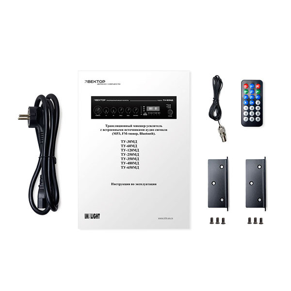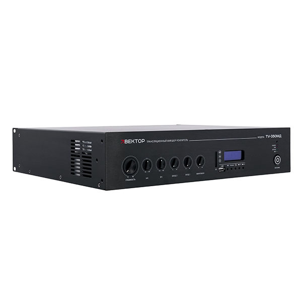Трансляционный усилитель Вектор ТУ-350МД — мощный комбинированный микшер-усилитель класса D на 350 Вт со встроенными аудиоисточниками (MP3-плеер, FM-тюнер, USB/SD, Bluetooth). Для музыкальной трансляции. Универсальный и 2 линейных входа, приоритет микрофона. Выход 100 В или 4–16 Ом. Эквалайзер НЧ/ВЧ, защита, зарядка USB. Рэковое крепление.