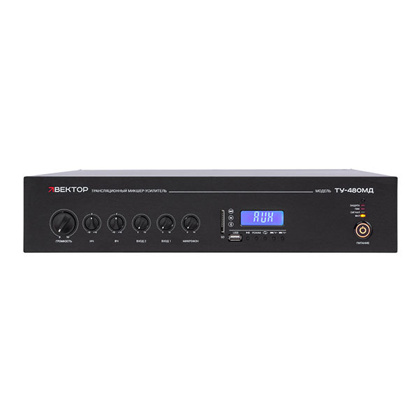 Трансляционный усилитель Вектор ТУ-480МД — комбинированный микшер-усилитель класса D мощностью 480 Вт со встроенными источниками сигнала (MP3, FM, USB/SD, Bluetooth). Для трансляции музыки и речевых оповещений. Универсальный вход с приоритетом, 2 линейных входа. Выход 100 В или на акустику 4–16 Ом. Эквалайзер, защита, функция зарядки. Рэковое крепление.