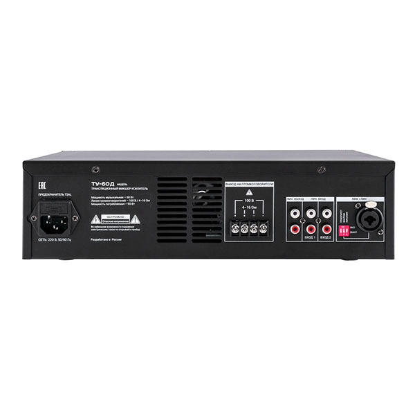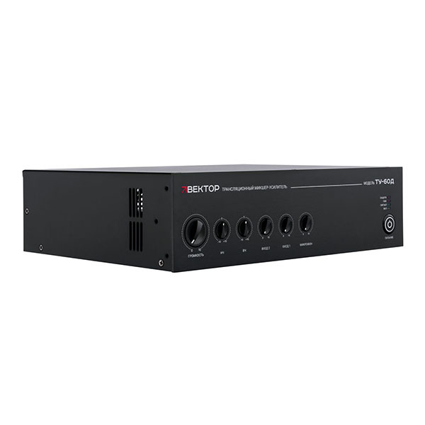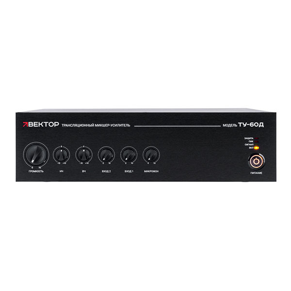 Трансляционный усилитель Вектор ТУ-60Д — микшер-усилитель класса D на 60 Вт для музыкально-речевого озвучивания небольших объектов. Универсальный вход (микрофон/линия) с приоритетом и фантомным питанием, 2 линейных входа. Выход 100 В или на акустику 4–16 Ом. Эквалайзер НЧ/ВЧ, защита от КЗ и перегрузки. Рэковое крепление.