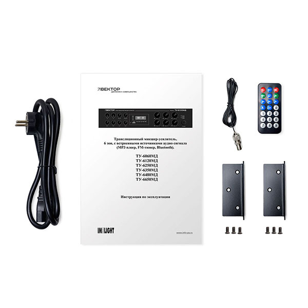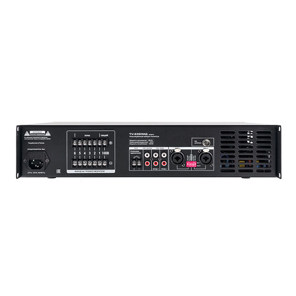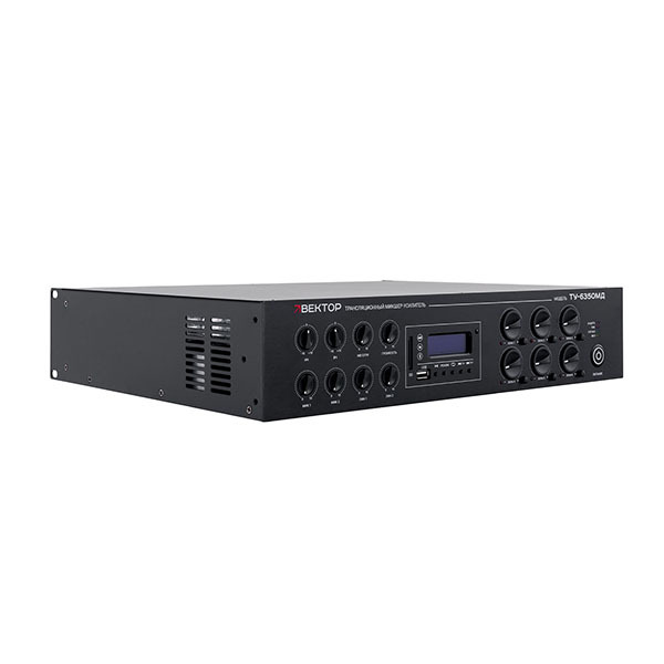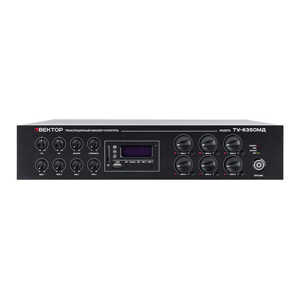 Трансляционный усилитель Вектор ТУ-6350МД — комбинированный 6-зонный трансляционный микшер-усилитель класса D мощностью 350 Вт со встроенными аудиоисточниками (MP3-плеер, FM-тюнер, Bluetooth). Для звукоусиления и трансляции в многозонных системах. 2 микрофонных и 2 линейных входа, 6 групп выходов 100 В. Индивидуальная регулировка, эквалайзер, защита, зарядка USB. Рэковое крепление.