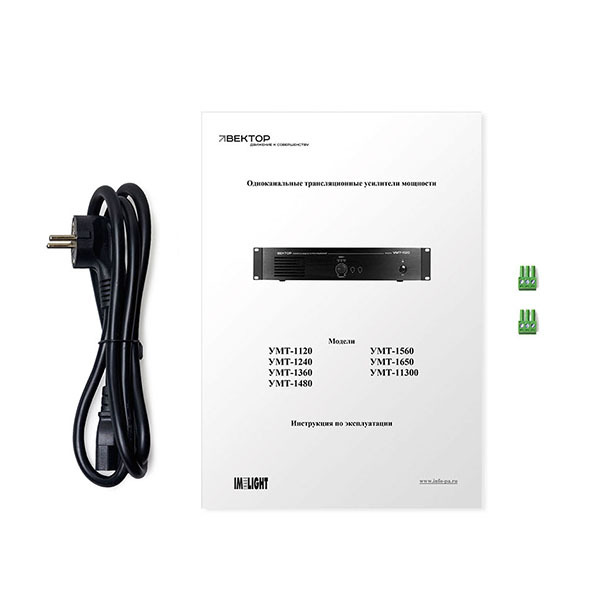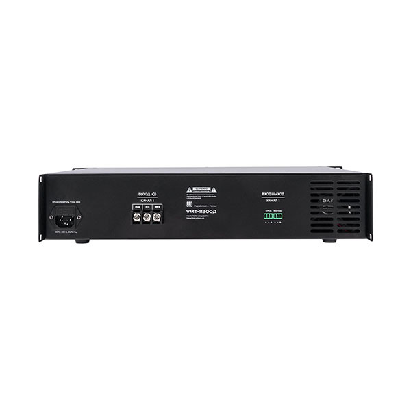 Трансляционный усилитель Вектор УМТ-11300Д — высокомощный усилитель мощности класса D на 1300 Вт для систем трансляции и аварийного оповещения. Выходы на громкоговорители 100 В и 70 В. Линейные входы/выходы на разъемах Phoenix. Защита от КЗ и перегрузки, индикация состояния. Предназначен для крупных объектов и распределенных систем.