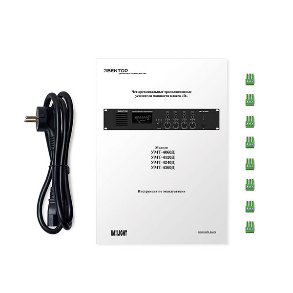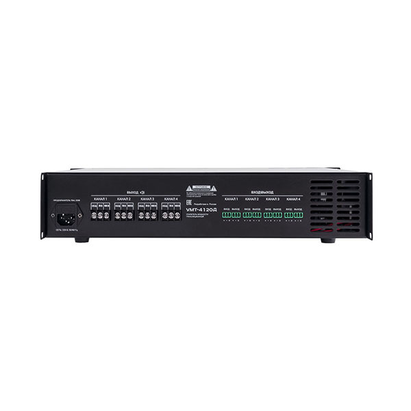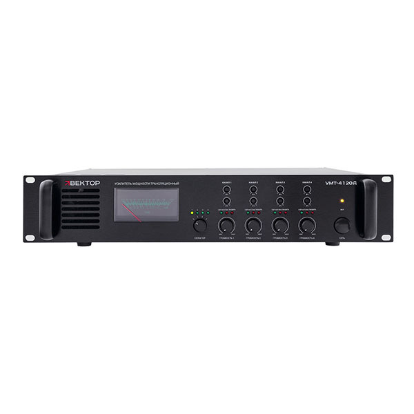 Трансляционный усилитель Вектор УМТ-4120Д — четырехканальный усилитель мощности класса D (4х120 Вт) для систем трансляции и аварийного оповещения. Четыре независимых канала. Выходы на громкоговорители 100 В, 70 В. Линейные входы/выходы на разъемах Phoenix. Защита от КЗ и перегрузки, индикация состояния. Для создания гибких многозонных систем озвучивания.