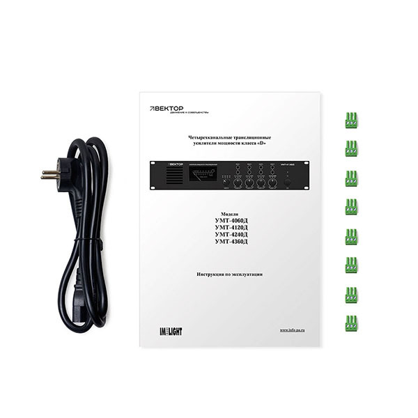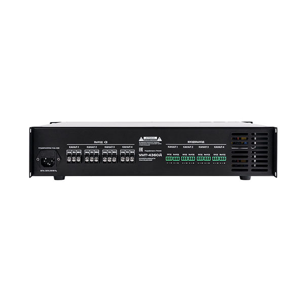 Трансляционный усилитель Вектор УМТ-4360Д — четырехканальный усилитель мощности класса D (4х360 Вт) для сложных систем трансляции и аварийного оповещения. Четыре независимых канала. Выходы на громкоговорители 100 В, 70 В. Линейные входы/выходы на разъемах Phoenix. Защита от КЗ и перегрузки, индикация состояния. Для объектов с большим количеством зон.
