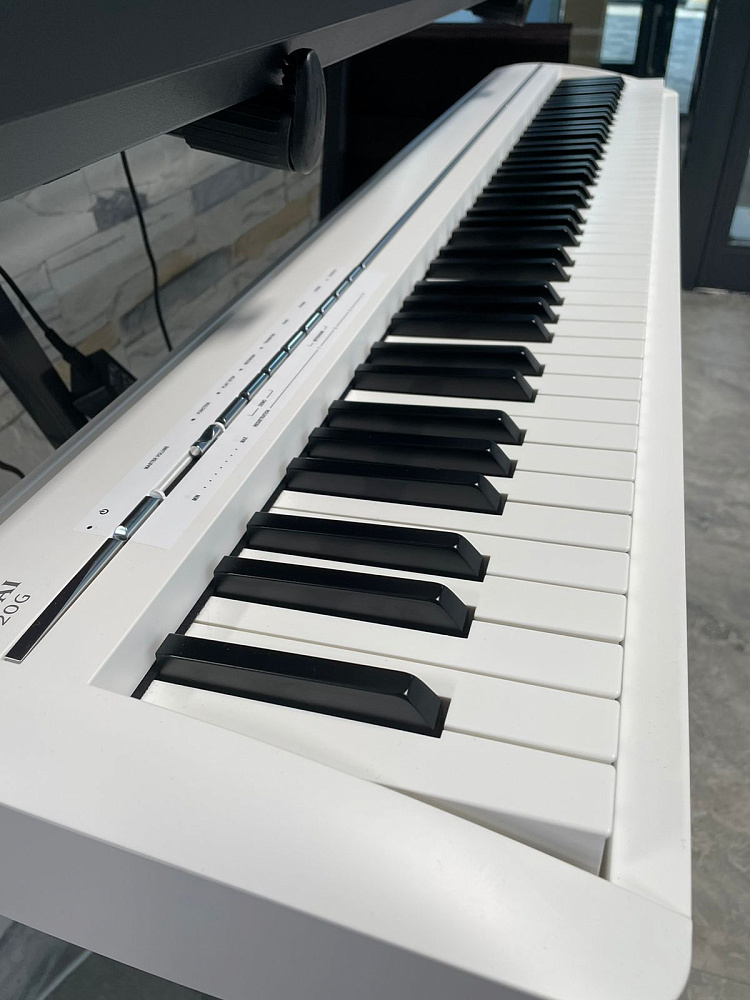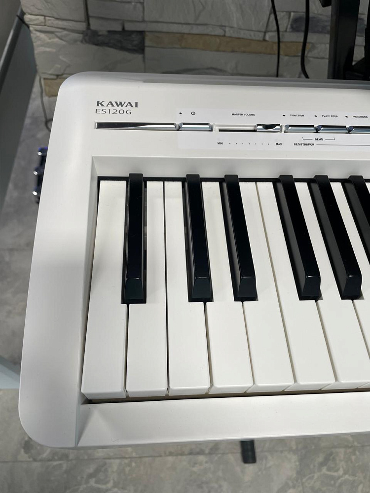 Цифровое пианино Kawai ES120G W — ультрапортативное цифровое пианино белого цвета. Клавиатура Responsive Hammer Compact, звуки роялей Shigeru Kawai SK-EX и EX, Bluetooth MIDI/Audio, 25 тембров. Вес 12.5 кг — для дома, сцены и занятий в дороге.