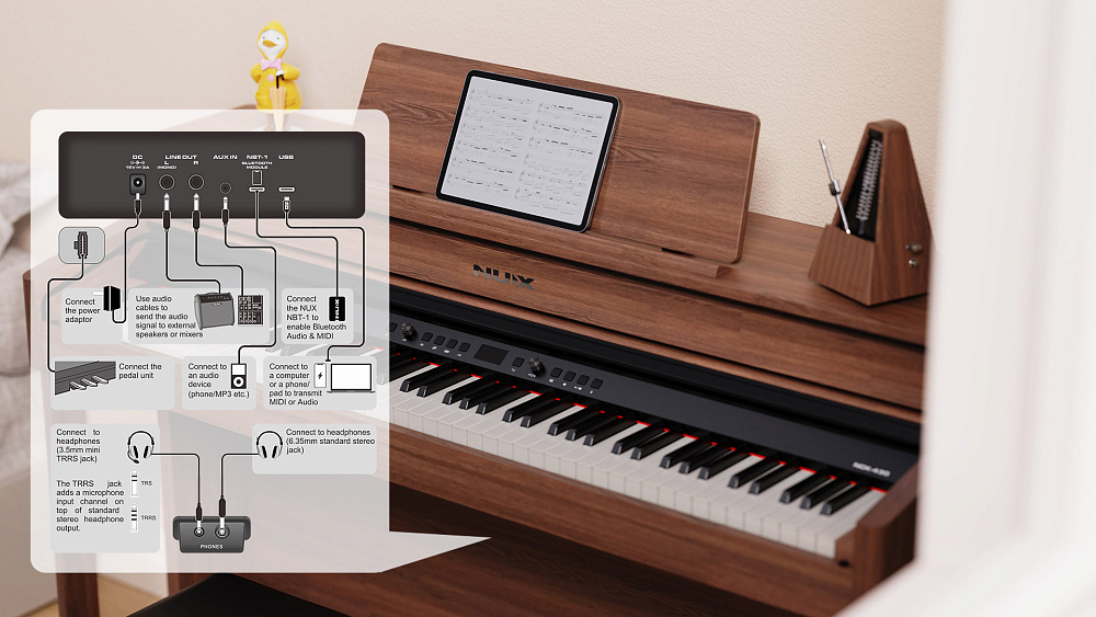 Благодаря технологии Bluetooth Audio, NCK-430 подключается к вашему смартфону или планшету для воспроизведения песен и треков. В то же время, технология Bluetooth MIDI обеспечивает интеграцию с мобильным приложением, делая ваши занятия более интерактивными и удобными.