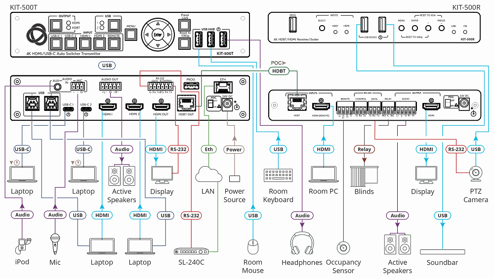 KIT-500 — комплект, состоящий из передающего и приёмного устройств. Передающее устройство KIT-500Т производит независимую (матричную) коммутацию сигнала с двух входов USB-C и двух комбинированных входов HDMI/USB на выходы HDMI и HDBaseT. Приёмное устройство KIT-500R осуществляет автоматический выбор между входом HDMI и входом HDBaseT и преобразует сигнал HDBaseT, принимаемый от передатчика KIT-500Т по кабелю типа «витая пара», в сигналы HDMI и USB с осуществлением повышающего или понижающего масштабирования видеосигнала c целью приведения разрешения к собственному разрешению подключенного к приёмнику дисплея HDMI. Данное решение позволяет подключить удалённые периферийные устройства (например USB-камеры) к локальному хосту. Комплект KIT-500 обеспечивает передачу сигнала по кабелю витой пары на расстояние до 40 м для разрешения 4K@60 Гц (4:2:0), и на расстояние до 70 м для разрешения Full HD 1080р@60 Гц.