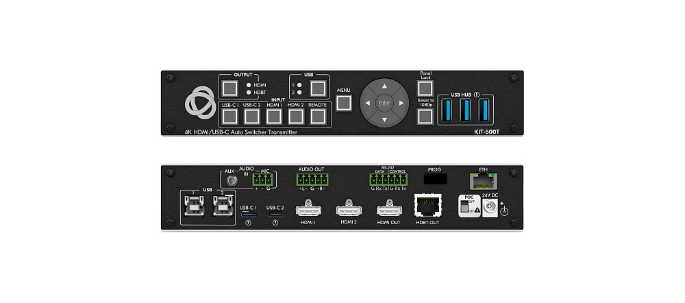 | Входы | Передатчик: 2 HDMI, 2 USB (USB-C), Микрофон/небалансное стерео аудио (3-конт. блок съёмных клемм), небалансное стерео аудио (mini-jack 3,5 мм), Приемник: HDBT (RJ-45), HDMI |
