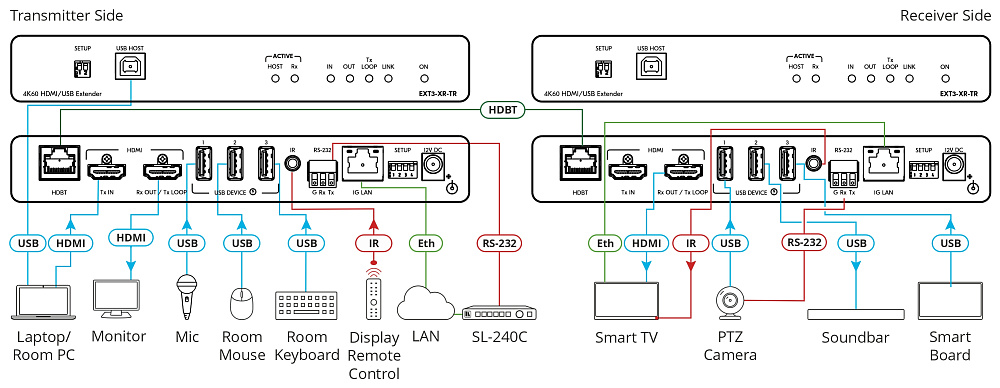 - Гибкие возможности удлинения интерфейса USB 2.0 — активный USB-хост может подключаться как на стороне передатчика, так и приёмника. Имеются отдельные порты для подключения USB-хоста и периферийных устройств. Сигналы USB 2.0 передаются в обоих направлениях между передатчиком и приёмником, что позволяет подключать активный хост как к локальным, так и удалённым периферийным устройствам, таким как видеокамеры, устройства аудио, а также различные устройства HID (Human Interface Devices), включая компьютерные клавиатуры, мыши, интерактивные доски и т.д.