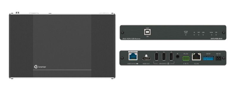 Приёмник Kramer EXT3-POE-XR-R — приемник сигналов HDBaseT 3.0 с питанием PoE. Поддержка 4K@60 Гц 4:4:4, интерфейсы USB, RS-232, Ethernet. Может быть источником PoE для удаленных устройств.