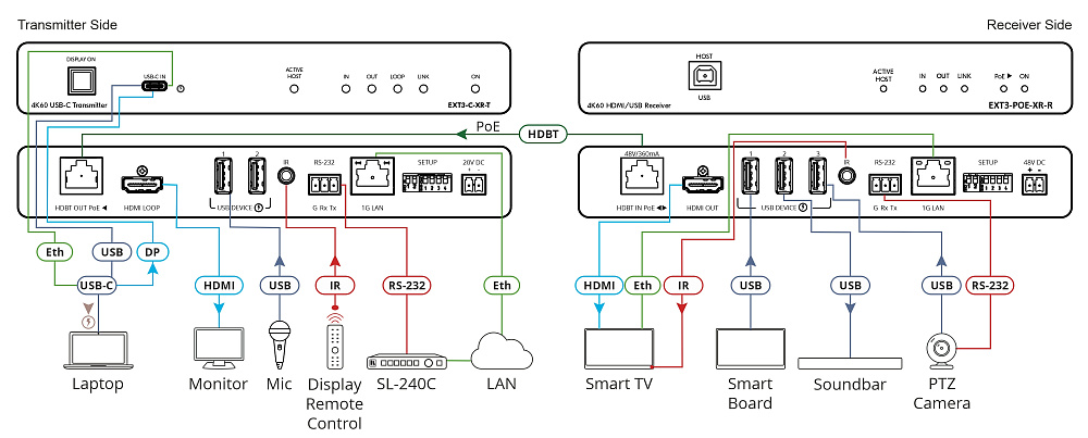 - Гибкие возможности удлинения интерфейса USB 2.0 — активный USB-хост может подключаться как на стороне передатчика, так и приёмника. Имеются отдельные порты для подключения USB-хоста и периферийных устройств. Сигналы USB 2.0 передаются в обоих направлениях между передатчиком и приёмником, что позволяет подключать активный хост как к локальным, так и удалённым периферийным устройствам, таким как видеокамеры, устройства аудио, а также различные устройства HID (Human Interface Devices), включая компьютерные клавиатуры, мыши, интерактивные доски и т.д.