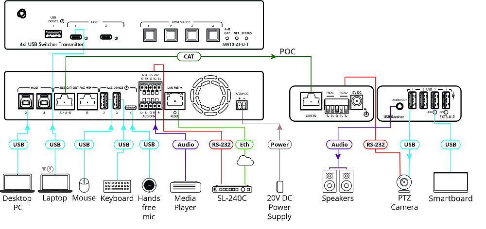- Большое разнообразие типов подключаемых периферийных устройств: PTZ-камеры, сенсорные видеопанели, интерактивные доски, внешние накопители, игровые консоли, саундбары, микрофоны, головные микрофонные гарнитуры, принтеры, сканнеры, устройства HID (Human Interface Devices), такие как компьютерные клавиатуры и мыши