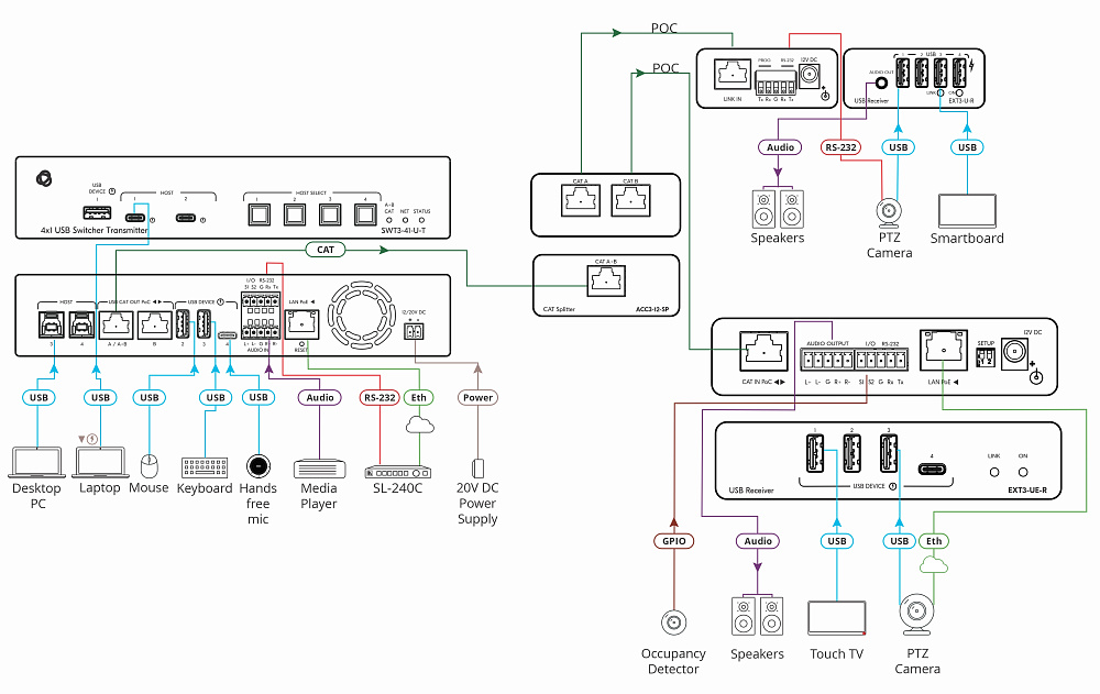- Простое управление периферийными USB-устройствами — удалённое управление по IP или RS-232 USB-устройствами, такими как PTZ-камеры и видео саундбары. Простая интеграция с платформой управления Kramer Control