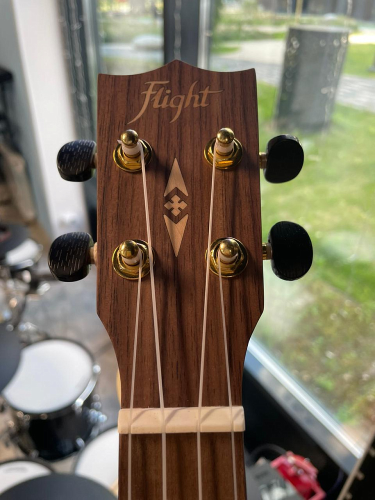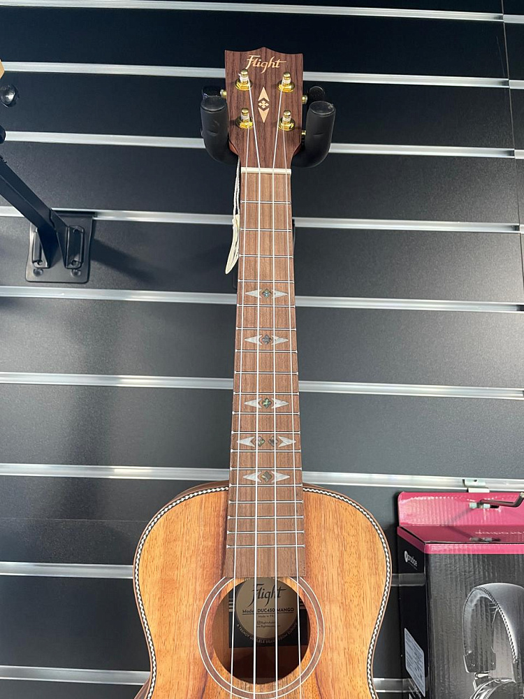 Укулеле концерт Flight DUC450 Mango — концертная укулеле из дерева манго. Итальянские струны Aquila, инкрустации на грифе, колки с позолотой. Сочный и насыщенный звук, в комплекте фирменный чехол.