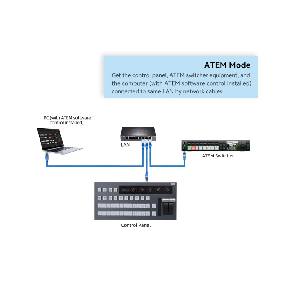 Одним из ключевых преимуществ KT-KD50x является его кроссплатформенность. Контроллер совместим с наиболее популярным программным обеспечением для видеопроизводства, включая ATEM Switchers, vMix, OBS Studio. Модель поддерживает как прямое подключение через локальную сеть (LAN), так и управление по протоколу MIDI, что позволяет гибко настраивать рабочее пространство и легко переключаться между разными тестовыми программами и технологическими платформами без потери функциональности или привычного интерфейса.