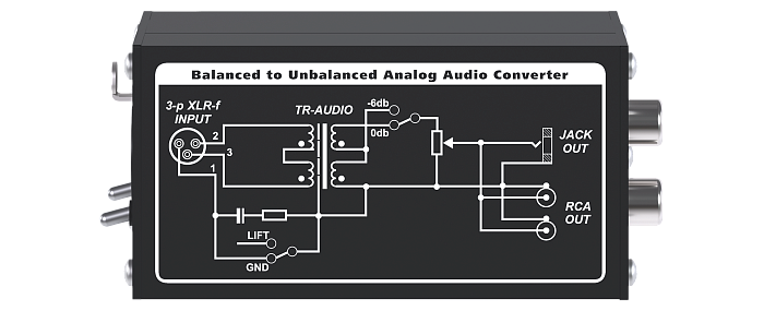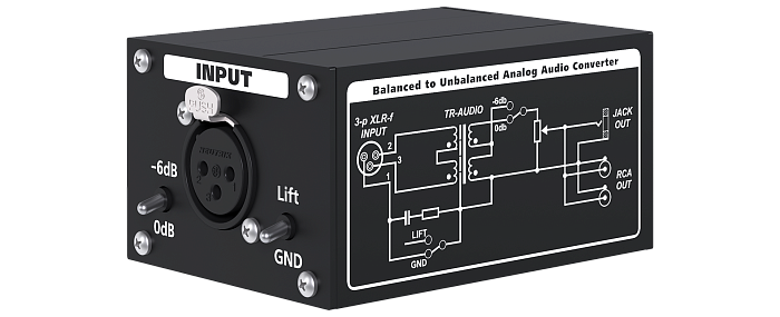 Преобразование выполняется высококачественным звуковым трансформатором английской фирмы «Oxford Electrical Products», который позволяет гальванически изолировать выход относительно входа, подавляя возможные сетевые и высокочастотные наводки и помехи. Дополнительно, устройство позволяет управлять соединением земель входа и выхода, регулировать ослабление выходного сигнала на -6дБ. Установленный регулятор дополнительно подстраивает коэффициент передачи в диапазоне от -35 до 0 дБ, позволяя точно установить требуемый коэффициент в зависимости от типа источника или приёмника сигнала.