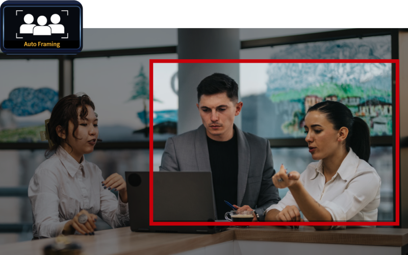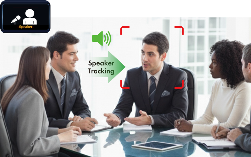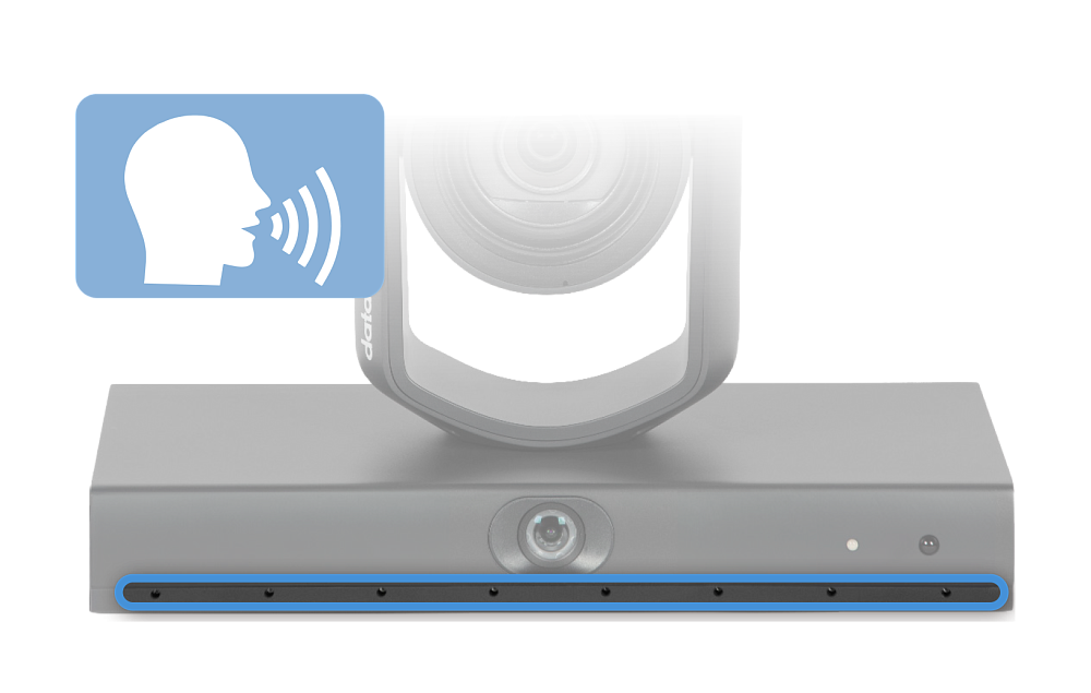 Такая конфигурация позволяет камере одновременно вести широкий обзор и точно отслеживать говорящего, автоматически переключаясь между панорамным и крупным планом по голосу.