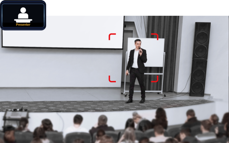 Верхний PTZ-объектив с 12-кратным оптическим зумом обеспечивает чёткие, детализированные крупные планы выступающего без потери качества.