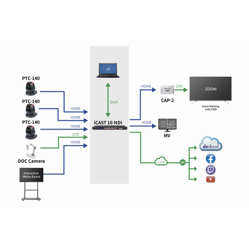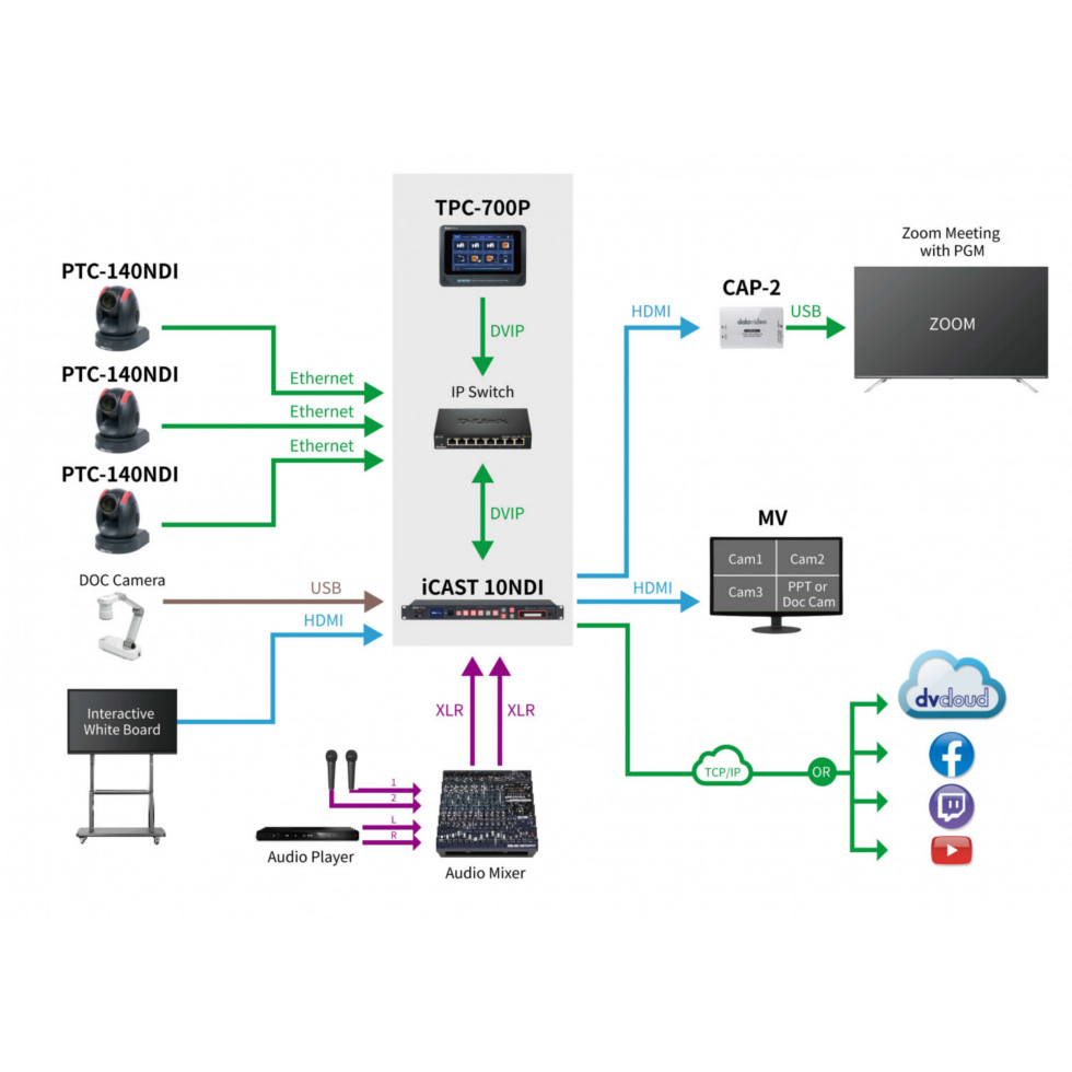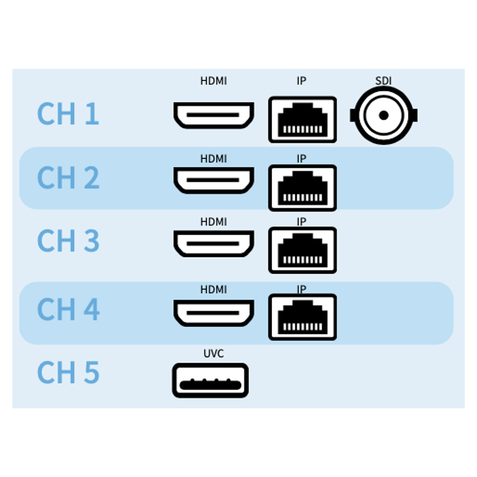 iCast 10NDI спроектирован для совместимости с широким спектром источников видеосигнала: PTZ-камер, документ-камер, ноутбуков и другого профессионального оборудования. Устройство оснащено пятью видеовходами с комплексной конфигурацией: