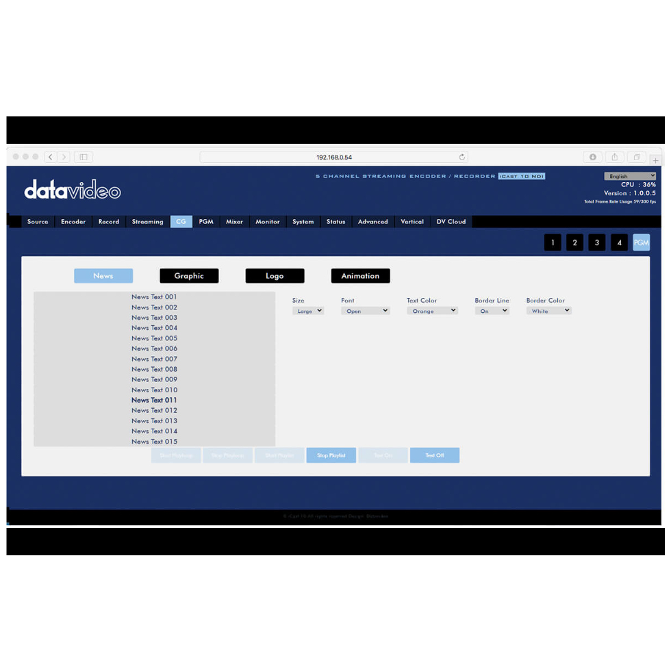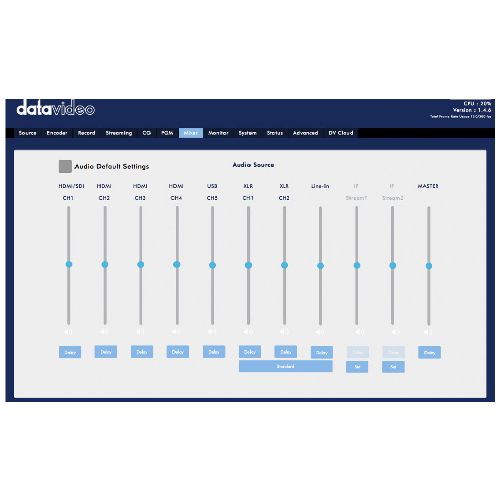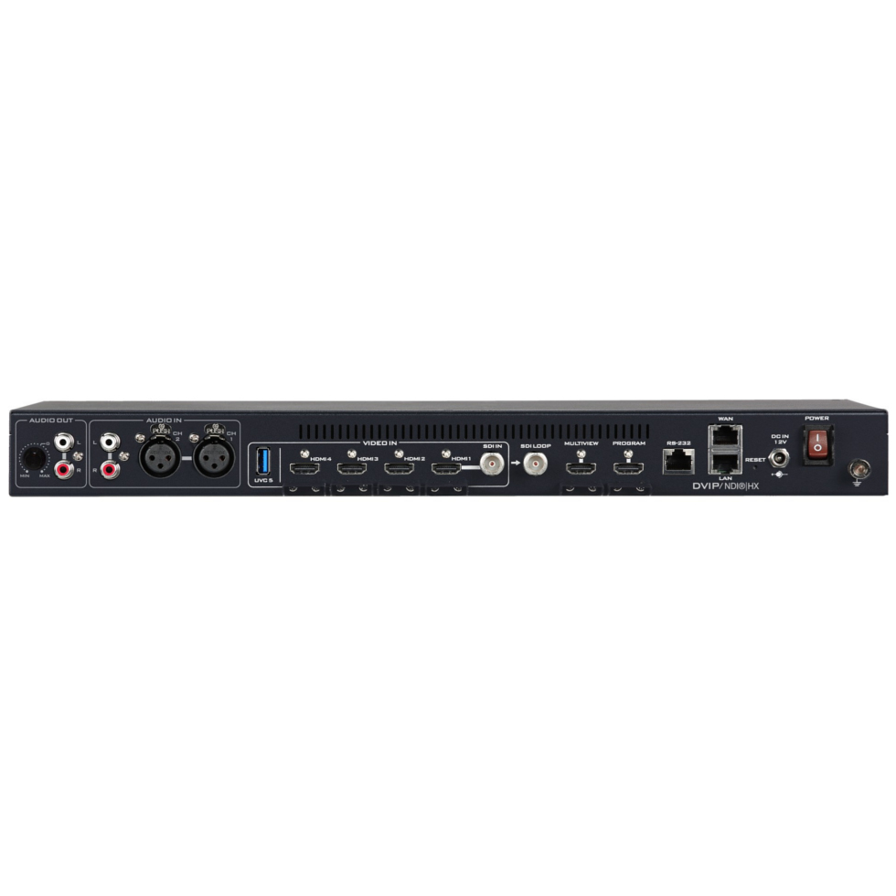 Встроенный сенсорный экран с предустановками позволяет быстро настраивать раскладку экрана, углы камеры и активировать стриминг или запись. Для дистанционного администрирования доступно управление через веб-интерфейс или по серийному порту RS-232 (RJ-45). Управление возможно как с помощью физических кнопок на передней панели, так и через встроенный сенсорный экран или удалённо через локальную сеть. Кнопки на передней панели предоставляют мгновенный доступ к запуску/остановке записи и стриминга. Встроенный аудиомикшер с поддержкой балансных XLR-входов и аудиозадержкой (каждый канал 0–3000 мс) обеспечивает точную синхронизацию видео и звука.