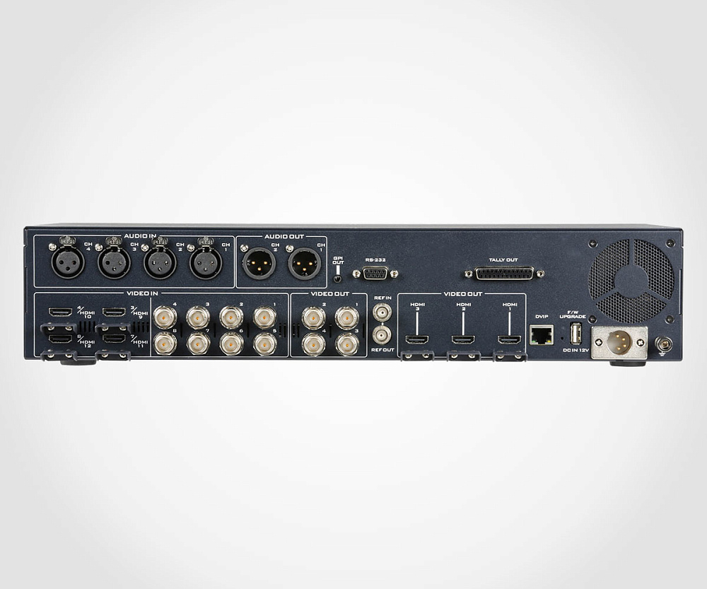 12-канальный режим высокого разрешения: Здесь можно использовать до 12 активных источников, но с частотой кадров 25/30p. Данный режим востребован в студийной работе, где приоритетом является максимальное количество камер при стандартной частоте кадров.