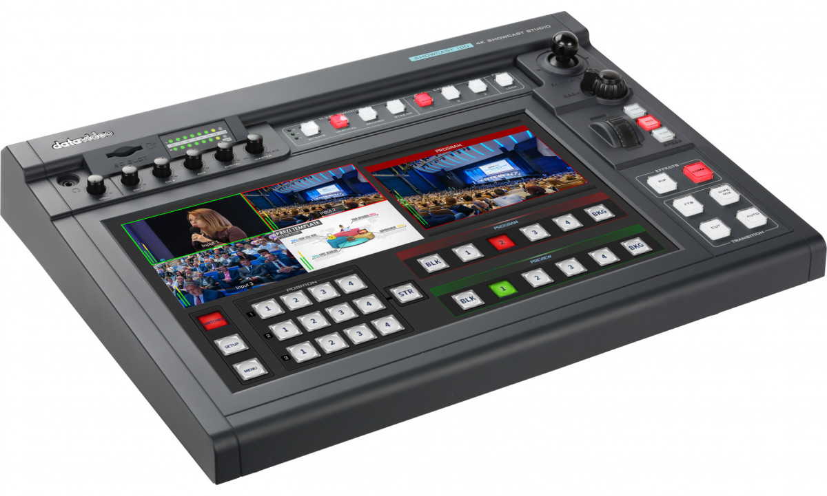Представьте себе устройство, которое заменит вам видеомикшер, титровальную станцию, контроллер PTZ-камер, кодировщик для трансляций, рекордер и аудиомикшер. Именно эту задачу решает Datavideo Showcast-100, объединяя в компактном корпусе с 14-дюймовым сенсорным экраном все необходимые инструменты для профессионального видеопроизводства. Благодаря 7 основным функциям в одном устройстве, Showcast-100 позволяет оператору сосредоточиться на творчестве, а не на подключении десятков блоков и кабелей. Достаточно подключить камеры, проектор и интернет — и можно начинать трансляцию в формате 4K.