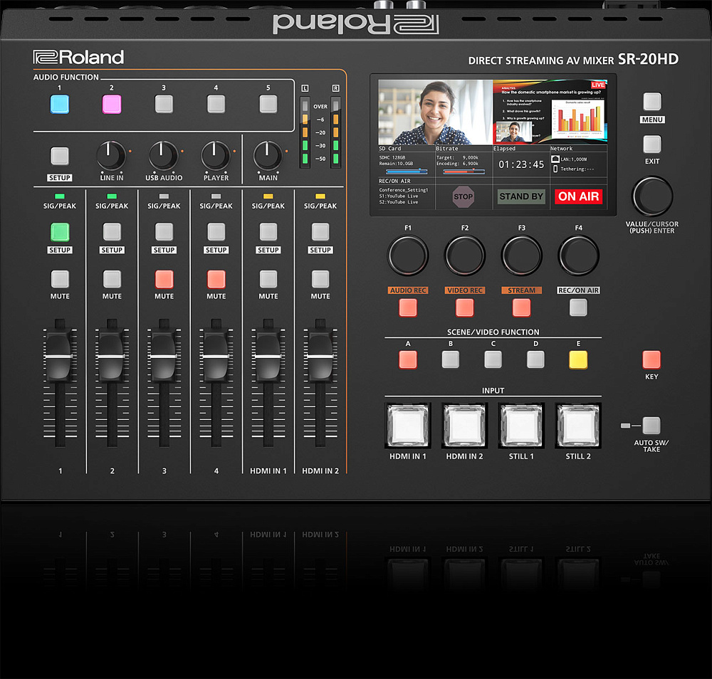 Видеомикшер Roland SR-20HD — прямой потоковый AV-микшер для трансляций без компьютера. Два кодировщика, запись на SDXC, 4 входа (2 HDMI, USB), 8-канальный аудиомикшер. Потоковая передача по LAN, поддержка SRT — для бизнес-трансляций и прямых эфиров.
