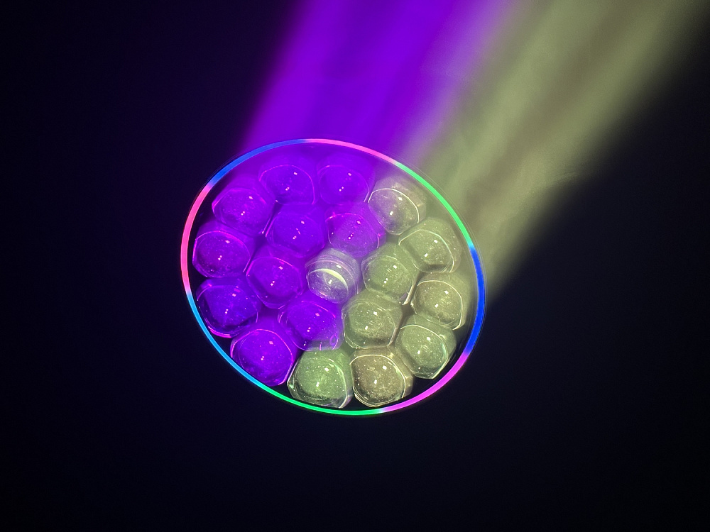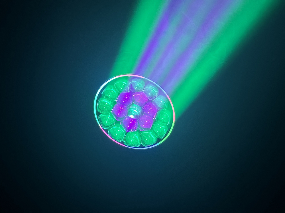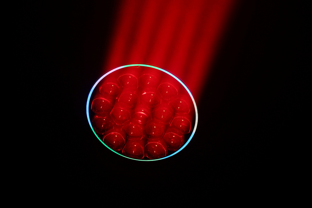 Благодаря моторизированному зуму с диапазоном угла раскрытия луча от 7° до 50°, прибор может мгновенно трансформироваться из узкого, пронзительного «взрывного» луча (BEAM), идеально визуализируемого в воздухе с помощью дыма или тумана, в мощный заливочный прожектор для равномерной цветовой заливки всей сцены (WASH). Дополнительным визуальным эффектом является вращающаяся в разные стороны фронтальная линза: в сочетании с предустановленными пресетами фигур она создаёт невероятные лучевые узоры, напоминающие калейдоскоп. Также прибор оснащён фронтальным светодиодным кольцом со встроенными макроэффектами, которое придаёт свечению дополнительный объём и эстетику.