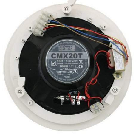 APart CMX20T - двухполосный потолочный громкоговоритель белого цвета с низкочастотным динамиком 8". Диффузор низкочастотного динамика выполнен из полипропилена, что позволяет использовать APart CMX20T во влажных помещениях и обеспечивает очень низкий уровень искажений. Для расширения воспроизводимых частот в APart CMX20T встроен высокочастотный динамик с купольным диффузором 1" из шелка. APart CMX20T идеально подходит для подходит как для воспроизведения музыки, так и речи. Каркас громкоговорителя выполнен из высококачественного пластика ABS. APart CMX20T может подключаться как к 100-вольтовым, так и к низкоомным аудио усилителям.
