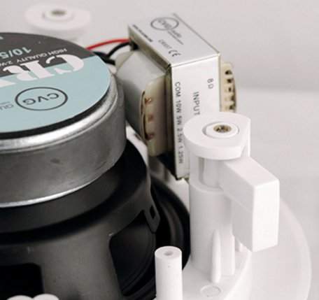 CVGaudio CRX6T предназначена для работы со 100V трансляционными линиями и имеет встроенный согласующий трансформатор с четырьмя отводами различной мощности. Выбор мощности осуществляется с помощью удобной самозажимной клеммы, которая фиксируется на отводе трансформатора выбранной мощности. Качественный согласующий трансформатор используемый в CVGaudio CRX6T имеет большой диапазон доступных для выбора мощностей (от 2,5 до 20W), что позволяет использовать данную акустическую систему в помещениях с практически любой высотой потолков.