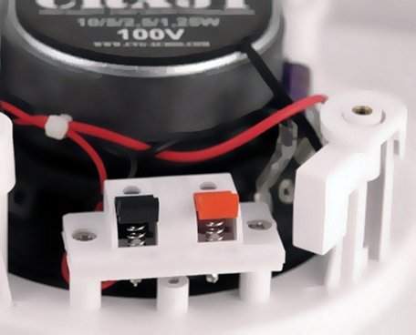 Корпус акустической системы оснащен удобными зажимами, которые фиксируются с помощью винтов с метрической резьбой. Данный крепеж позволяет быстро и без проблем установить динамик в подвесной потолок толщиной от 5 до 30мм. Спикерный кабель подключается динамику с помощью надежного самозажимного кабельного терминала.
